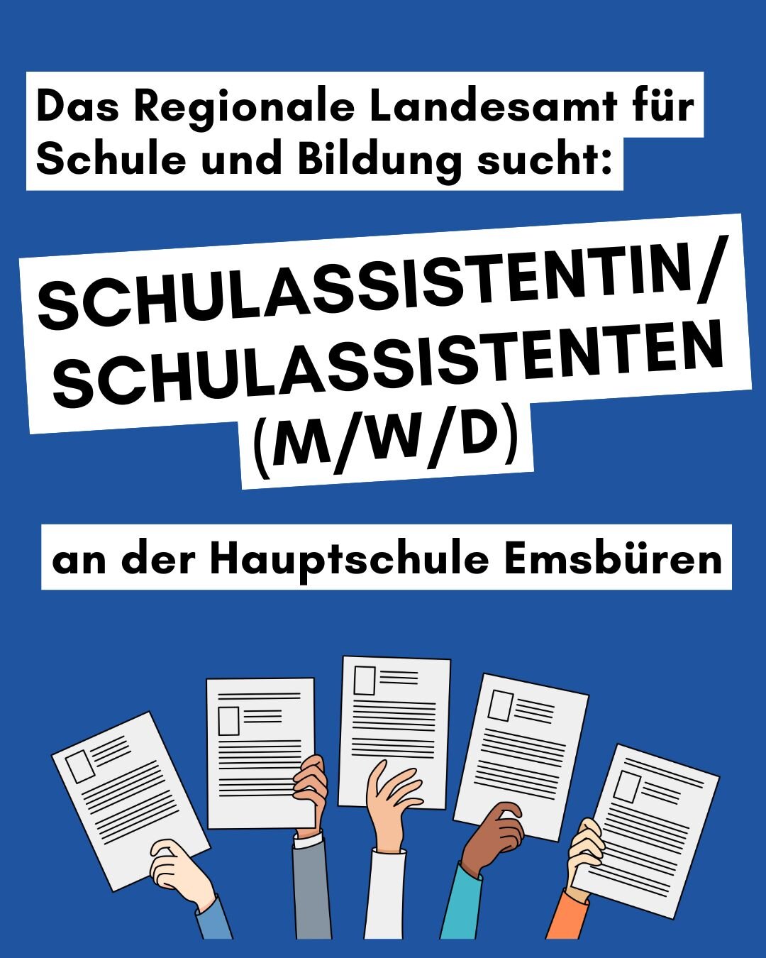 Das Regionale Landesamt für Schule und Bildung Osnabrück stellt ein: an der Hauptschule, Schützenstr. 8 in 48488 Emsbüren eine/-n Schulassistentin/ Schulassistenten (m/w/d).