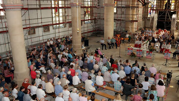 Pastor Stephan Schwegmann wies in der Begrüßung darauf hin, dass es möglicherweise der erste Baustellengottesdienst war, den die Kirchengemeinde in ihrer langen Geschichte je gefeiert hat. So verwunderte es nicht, dass Gläubige aller Generationen in die Kirche strömten und am Ende über 600 Gläubige auf Partybänken oder mitgebrachten Klappstühlen saßen, um den Gottesdienst mitzufeiern.