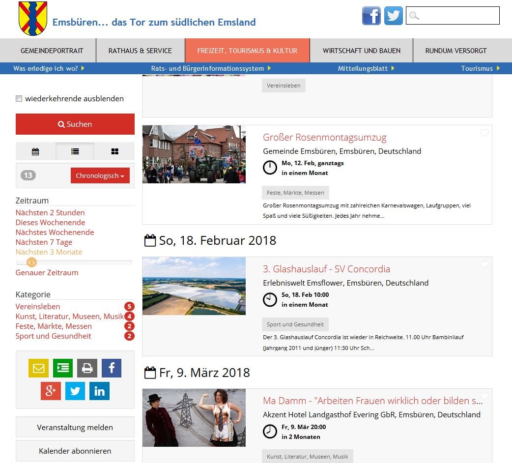 Die Gemeinde Emsbüren nutzt seit Anfang Januar nun die von der Emsland Touristik zur Verfügung gestellten emslandweiten Version eines Veranstaltungskalenders. Durch die Kooperation können öffentlich interessante Veranstaltungen im System automatisch geteilt und angezeigt werden. So kann z.B. der Veranstaltungstermin des großen Emsbürener Rosenmontagsumzugs in das Emsbürener System eingegeben und automatisch an die Internetseiten der Emsland Touristik, des Landkreises Emsland sowie weiterer gekoppelter Institutionen gesendet werden. Dadurch erhalten Emsbürener Veranstaltungen eine verbesserte Aufmerksamkeit.